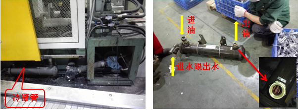 后經(jīng)力勁維修師傅將冷凝器拆下,將冷凝器裝油部分裝滿水,塞住冷卻水的出水口,往進水口打入壓縮空氣,發(fā)現(xiàn)進油口跟出油口有氣泡排出